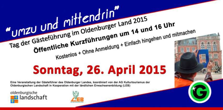 Am Sonntag, dem 26. April 2015 findet im gesamten Oldenburger Land, von der Küste bis zum Dümmer der Tag der Gästeführungen statt. An beinahe 50 Orten werden landauf landab interessante und spannende Führungen veranstaltet. Alle Führungen sind kostenlos und ohne Anmeldung zu nutzen.